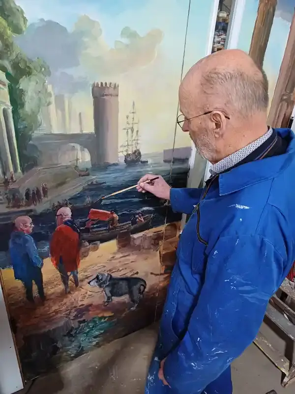 René Domburg, onze schilderdocent, heeft de toegangsdeur van Atelier HubertsArt omgetoverd tot een visueel avontuur! Aan beide kanten van de deur schilderde hij een prachtig tafereel van "De inscheping van de koningin van Sheba" in verschillende stijlen. Je wandelt letterlijk door het schilderij heen wanneer je binnenkomt. Kom langs en bewonder het zelf! π¨β¨