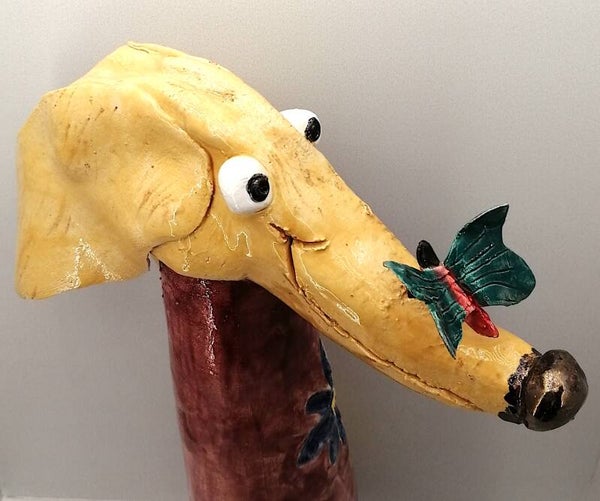 Handgemaakte keramieken teckel met bewegende vlinder op de neus.