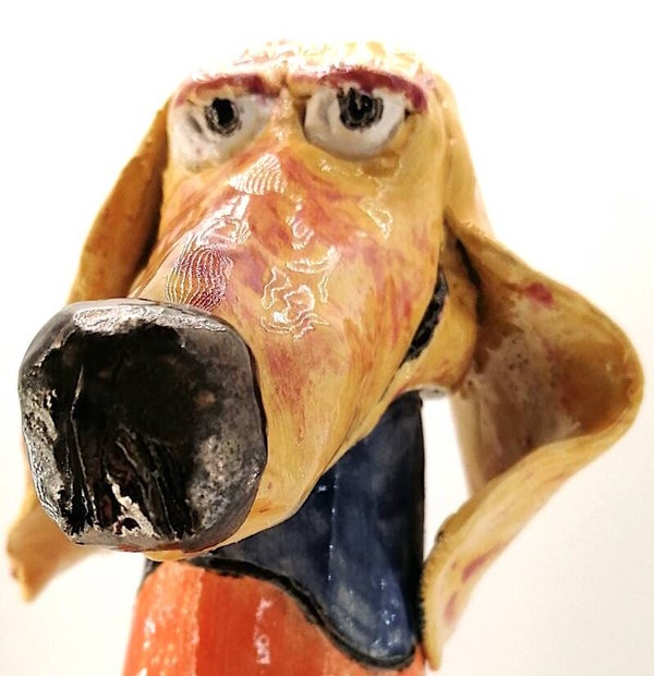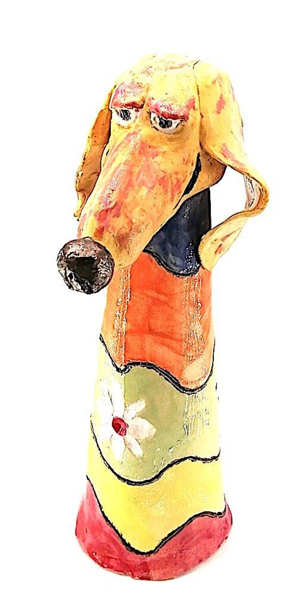 Handgemaakt grappige keramieken teckel figuur.