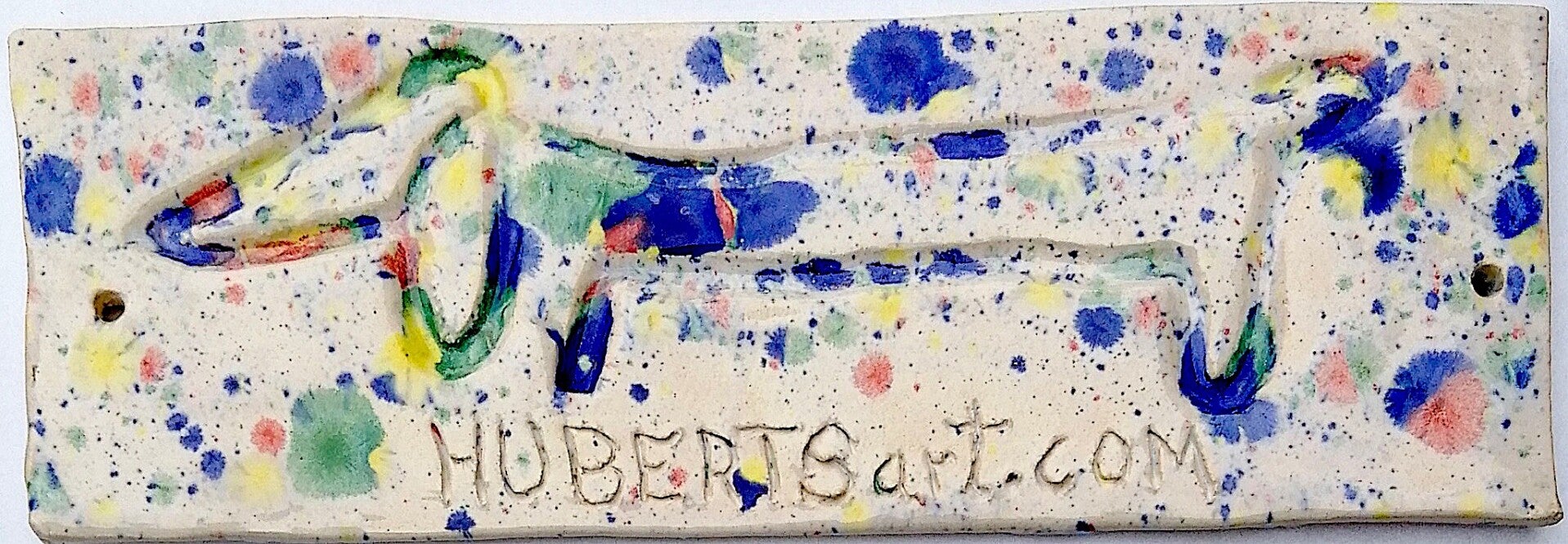 Hand-formed and glazed unique name plate in the color 8 Harlekin.
