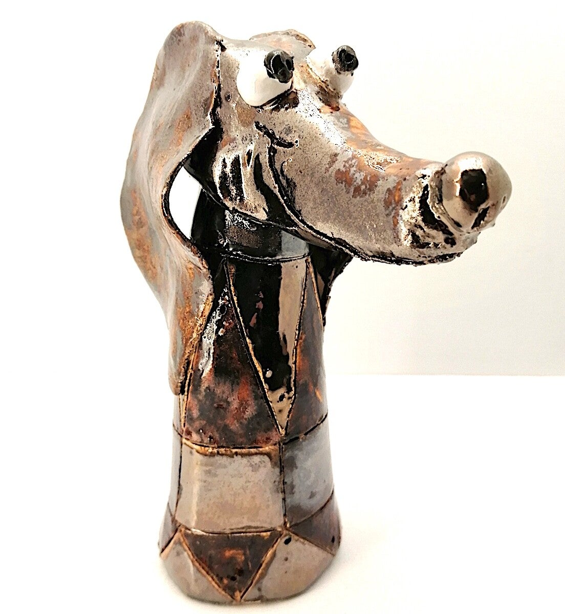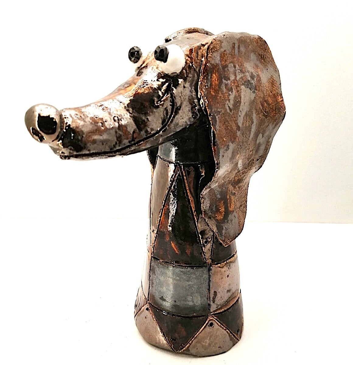 Handgemaakt keramieken dwerg teckel met metaalkleuren goud, zilver, brons en avemarein geglazuurd.