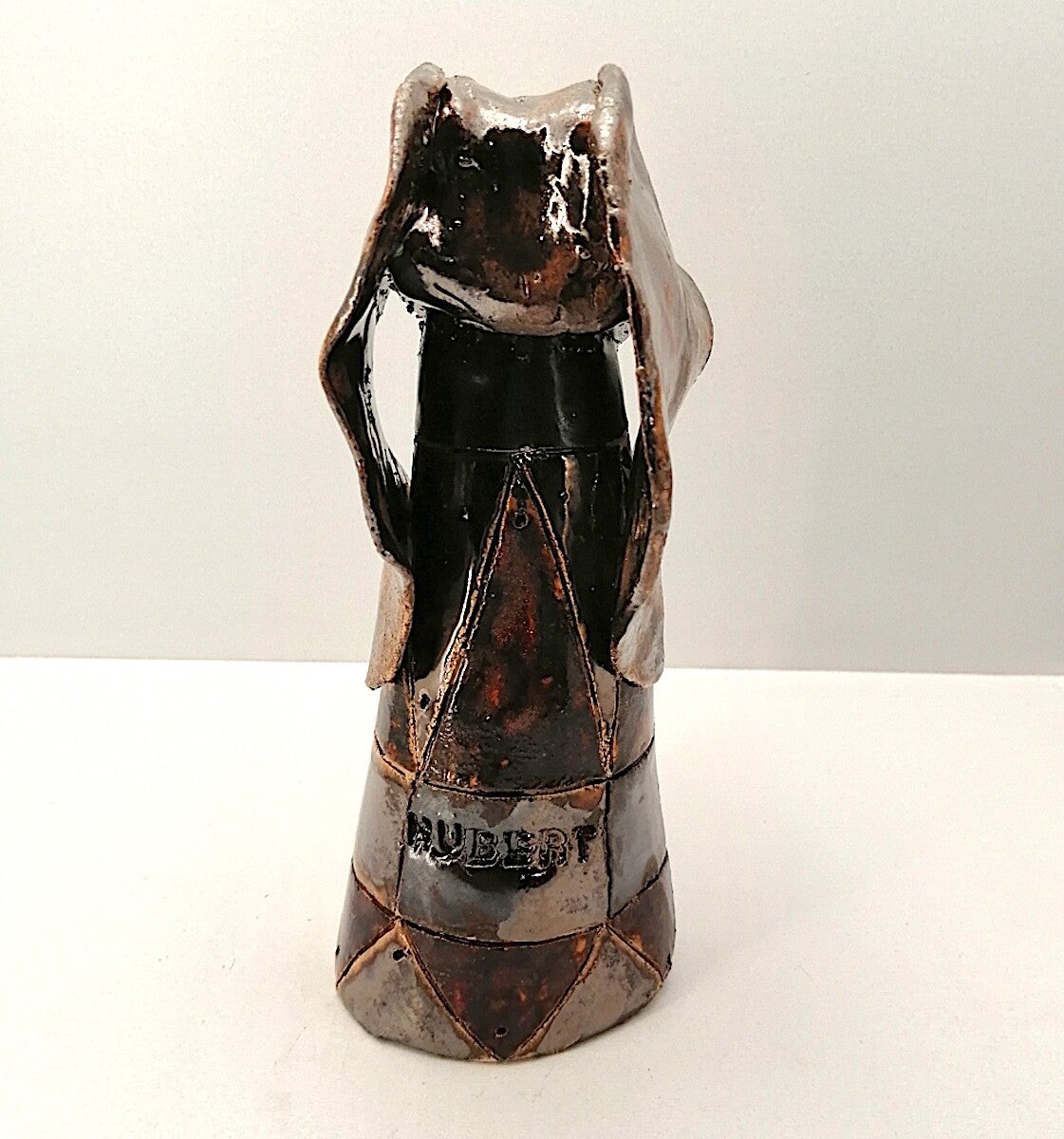 Handgefertigter Zwerg Dackel mit metallischem Glasuren Gold, Silber, Bronze und Avemarein glasiert.