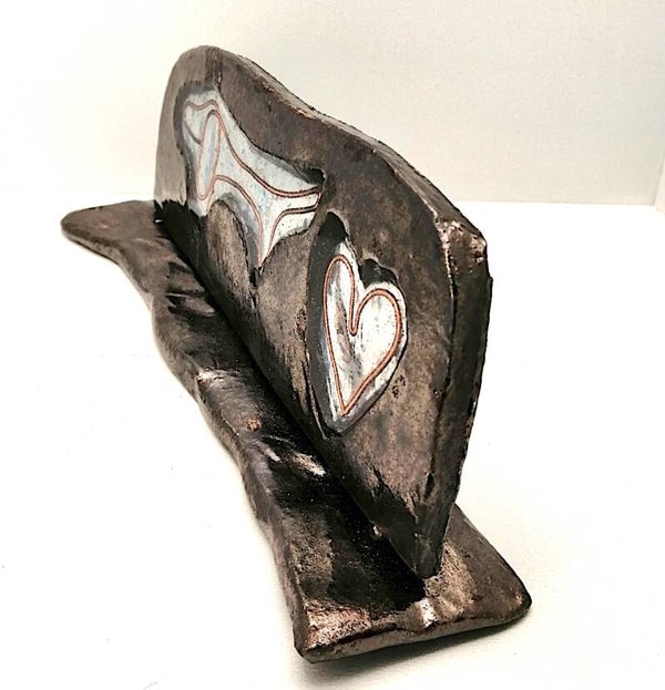 Handgemaakt keramieken gedenksteen in metaalkleuren goud, zilver, brons en avemarein geglazuurd.