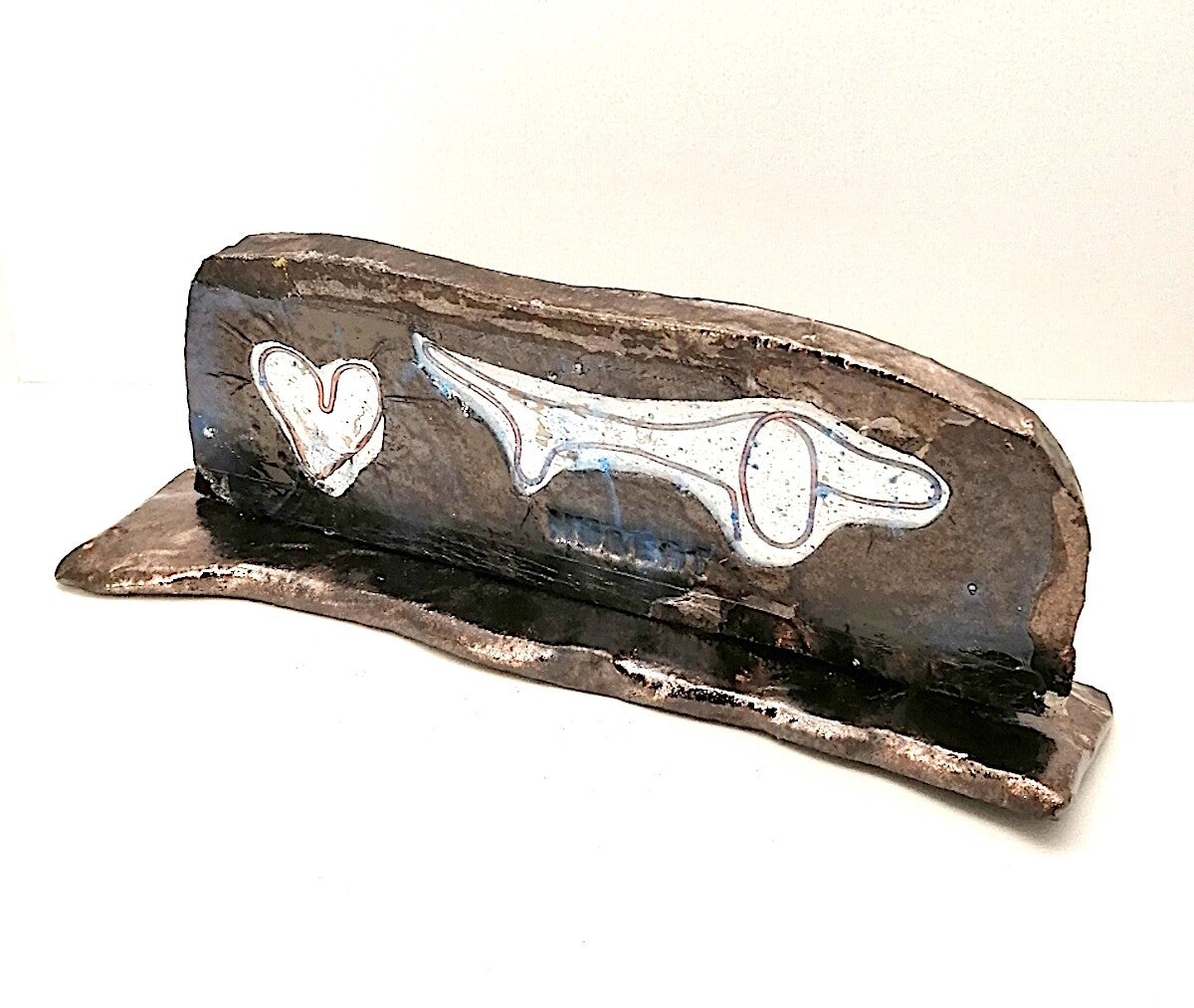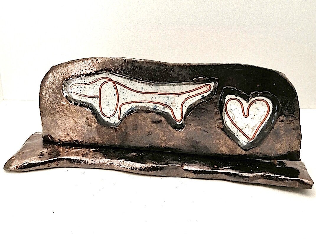 Handgeformtes kupfernes Hündchen mit Herz in Harz gegossen mit Perlmutt-Farbpigmenten.