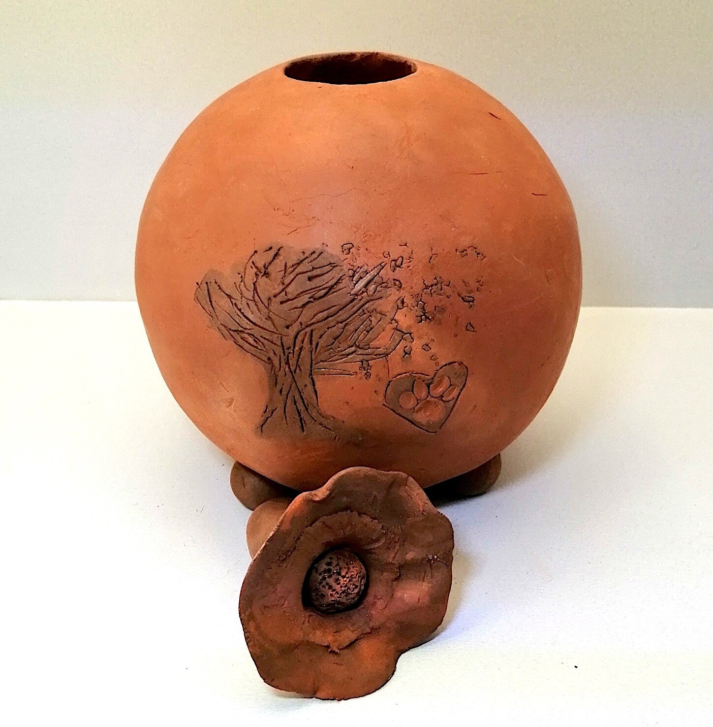 For the colors I have used natural clay colors from different parts of the country. For the design of the colors I used a special intarsia technique.The urn is fired with self-generated energy at a low temperature. This allows the urn in the ground or water to fully return to nature.