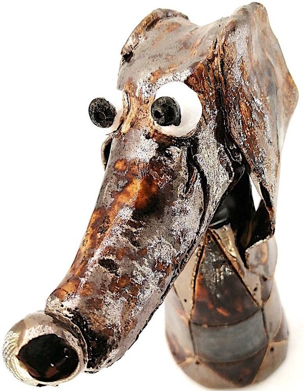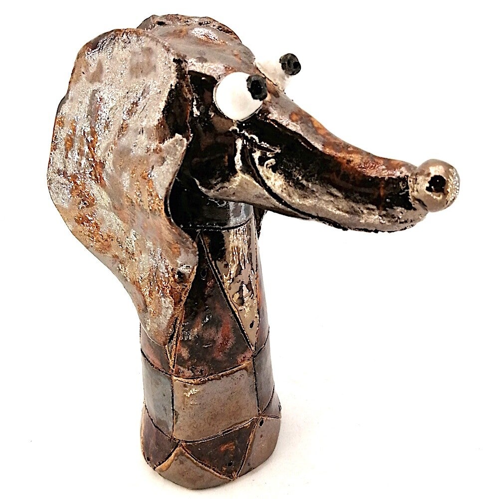 Handgemaakt keramieken dwerg teckel met metaalkleuren goud, zilver, brons en avemarein geglazuurd.